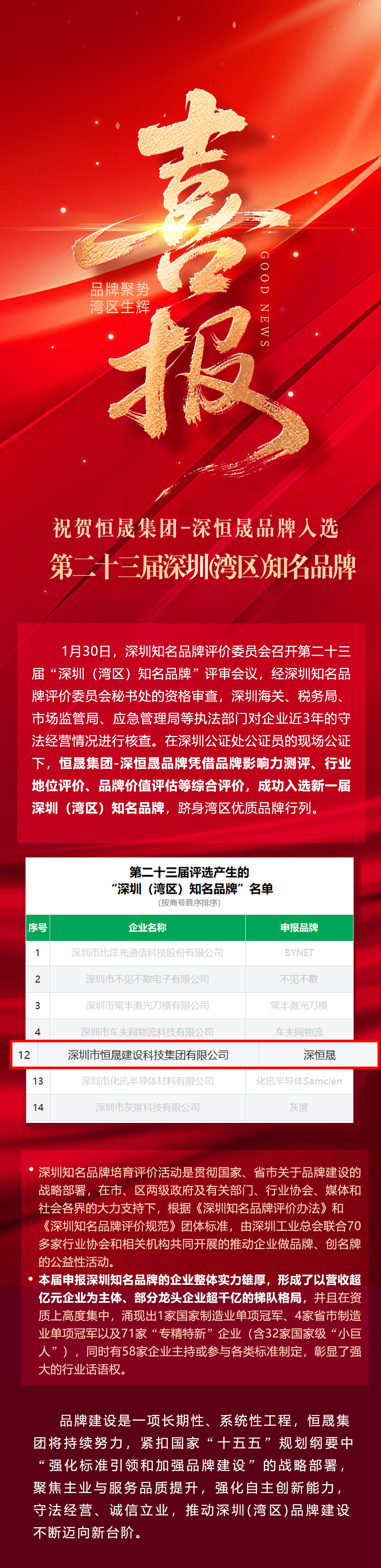 恒晟集团入选第二十三届深圳(湾区)知名品牌